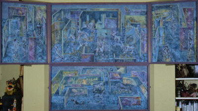 Several things happened to push the project along. I saw a metal toy puppet of Muffin the Mule in a museum of childhood in Edinburgh, which was identical to one I has as a child in the 1950s. I read a science fiction novel about a labyrinth of Mirrors which kept displaying different time zones. I had already thought I would like to represent the family as different animals in a painting. I had some information about using animals as symbols for different attributes, (the lamb is an obvious one). The idea quickly formed that I could choose a member of the family which most suited each animal. My sister-in-law was not too sure about being represented by Hubert the Hippo until I told her that the hippopotamus was the symbol of the great earth mother!