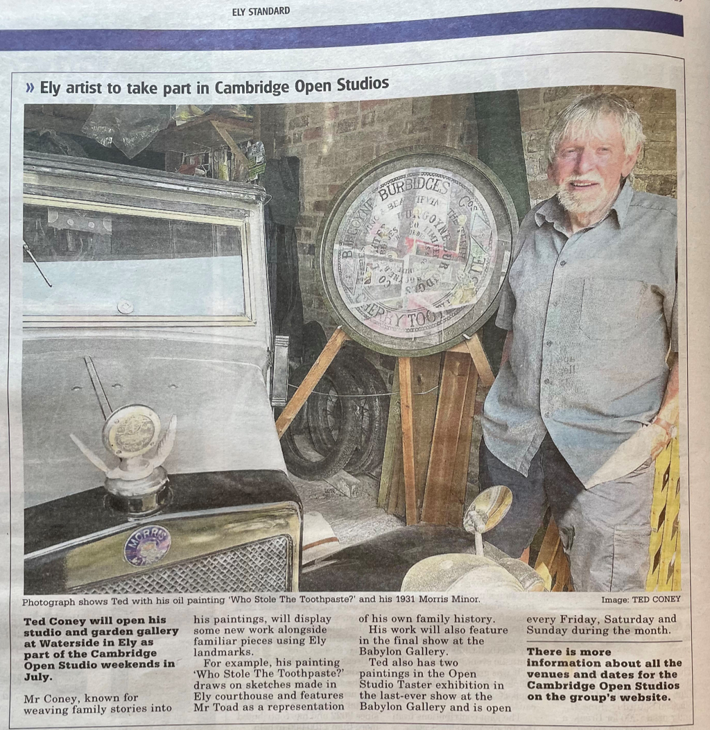 For example, his painting ‘Who Stole the Toothpaste?’ draws on sketches made in Ely courthouse and features Mr Toad as representation of his own family hsitory.