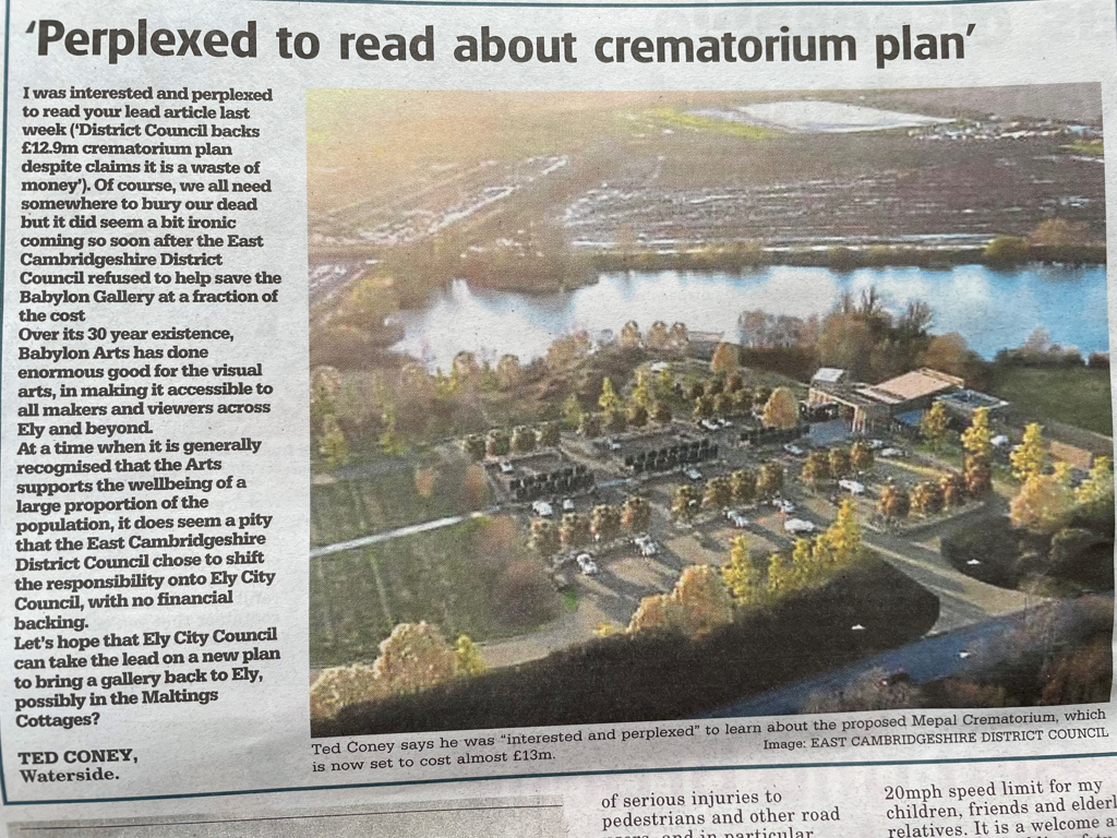 I was interested and perplexed to read your lead article last week (‘District Council backs £12.9m crematorium plan despite claims it is a waste of money’). Of course, we all need somewhere to bury our dead but it did seem a bit ironic coming so soon after the East Cambridgeshire District Council refused to save help the Babylon Gallery at a fraction of the cost.